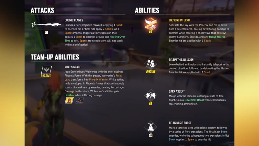 In team dynamics, Phoenix partners with Wolverine through her passive ability, Mind’s Grace. When teamed up, Wolverine’s Feral Leap transforms into Phoenix Warrior, thanks to Phoenix’s empowering presence. During this state, Wolverine becomes engulfed in Phoenix flames, dealing damage to himself and nearby enemies. His abilities gain lifesteal benefits, allowing him to recover health when inflicting damage, enhancing both his survivability and offensive capabilities.